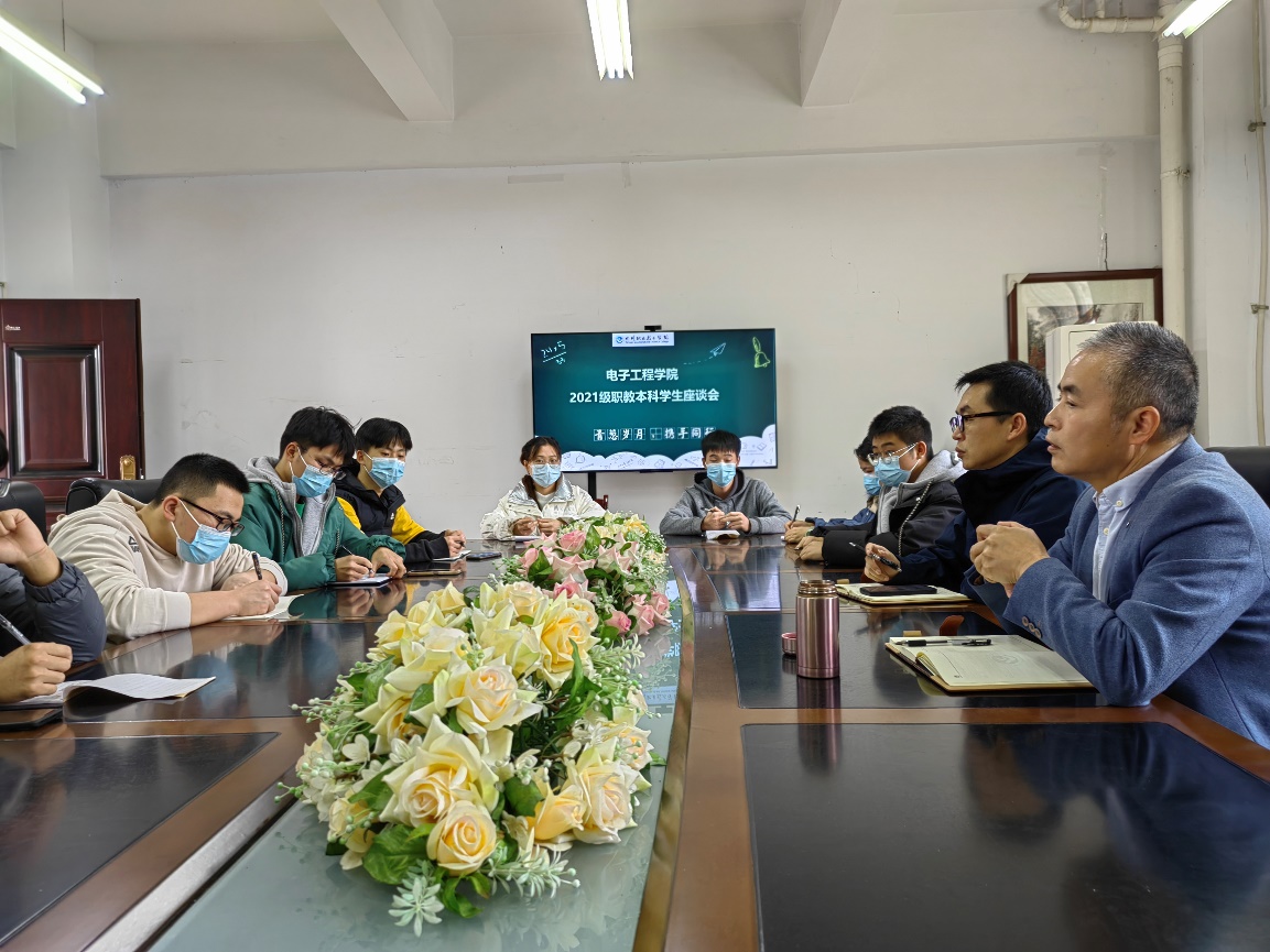 为加强职教本科专业教学管理,提升教学质量,推动教风、学风相互促进,11月17日下午,电子工程学院召开了本科教学工作专题会,本次专题会分阶段开展,第一阶段为本科学生座谈会。电子工程学院党总支书记罗强、院长唐林,教学科科长,学生科科长和21电教班班主任参加了本次座谈会。21级职教师资本科学生座谈会以更好的了解学生学习和生活,更好的倾听学生心声为目的,在平等、轻松、开放的氛围中展开了交流,学生代表围绕学习生活现状与老师们交流,提出了在学习生活中遇到的一些问题。座谈中,学生代表积极发言反馈学情,老师们仔细倾听,详细记录,并针对问题进行了现场解答。电子工程学院院长唐林老师就职教本科试点工作的开展情况,和西华师大联合教研交流情况并结合自身经历,向同学们提出宝贵的建议。他认为同学们要了解自己的专业特色,就业方向,根据自己未来的发展方向制定学习计划,合理安排时间,在学习的过程中挖掘天赋,弥补不足,不断进步,在实践过程中锻炼自己的思考能力,加强专业知识的学习,构建自己的知识体系和思维体系。电子工程学院党总支书记罗强老师强调了确定发展目标的重要性,指出作为当代大学生,要提高自己的思想政治水平,要以锻炼自己能力为目标,并围绕如何提升自身能力给同学们提出了建议。