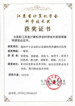 近日,我校与常州信息职业技术学院、南京信息职业技术学院联合研发的“面向中小企业的云边端协同关键技术应用”项目,荣获江苏省计算机学会科学技术奖一等奖。