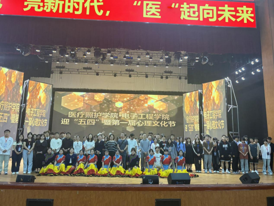 在五四青年节即将来临之际,为丰富校园文化生活,促进校园心理健康教育的建设与发展,4月22日,电子工程学院与医疗照护学院联合举办迎“五四”暨第一届心理文化节文艺晚会,两个学院的领导、教师及各班级学生观看演出。